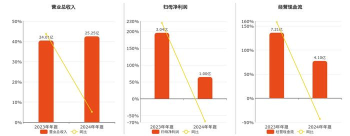 公司营业总收入为25.25亿元。归母净利润为1.00亿元,较去年同报告期归母净利润减少2.04亿元,同比较去年同期下降67.09%。经营活动现金净流入为4.10亿元,较去年同报告期经营活动现金净流入减少3.11亿元,同比较去年同期下降43.09%。
